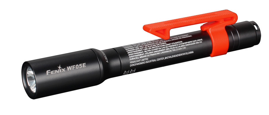 Profesionální svítilna Fenix WF05E s certifikací ATEX/IEC pro použití ve výbušném prostředí. Svítilna je napájená dvěma mikrotužkovými (AAA) bateriemi a poskytuje světelný tok až 85 lumenů. Tělo svítilny je vyrobeno z hliníkové slitiny pro vysokou odolnost a nárazuvzdornost a spona z antistatického plastu. Svítilna je určena zvláště pro hasiče, záchranáře, použití v chemických, ropných, textilních a metalurgických provozech a dalších oblastech, kde nelze použít běžné svítilny. Tvarově připomíná pero a lze ji tak nosit například v náprsní kapse. Svítilna není určena pro použití v dolech.