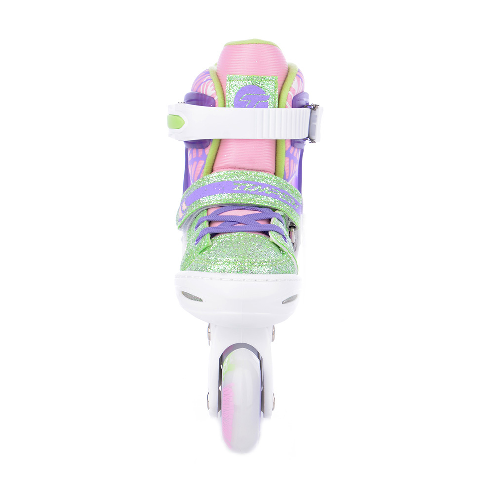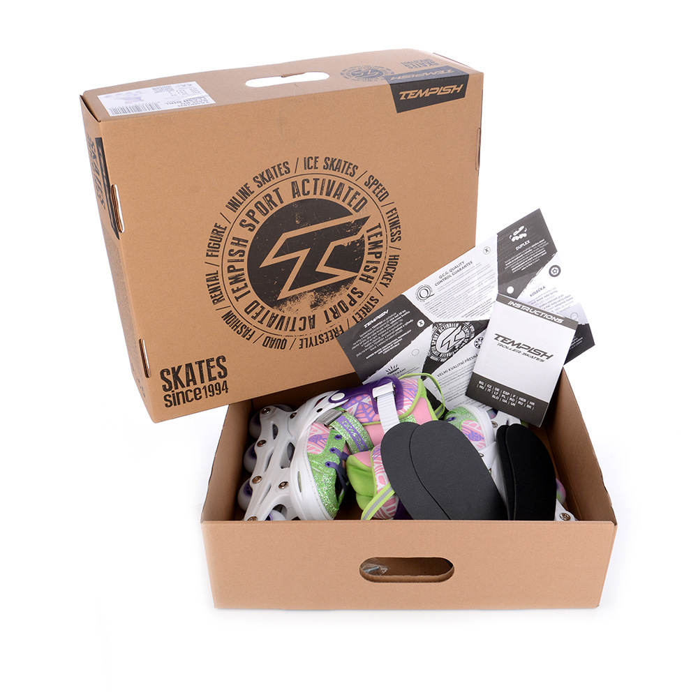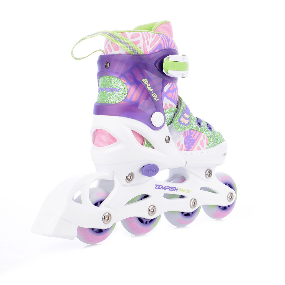 Tempish BAM-BU FLASH GIRL jsou nejmenší dětské kolečkové brusle z nabídky Tempish, ideální pro první jízdy i pokročilejší dětské bruslaře. Díky chytrému nastavitelnému skeletu začínají už na velikosti EU 26 a mohou růst spolu s dítětem – nastavení zvládnete snadno a rychle pomocí systému EASY PUSH (stisknutí pojistky a posunutí špičky).