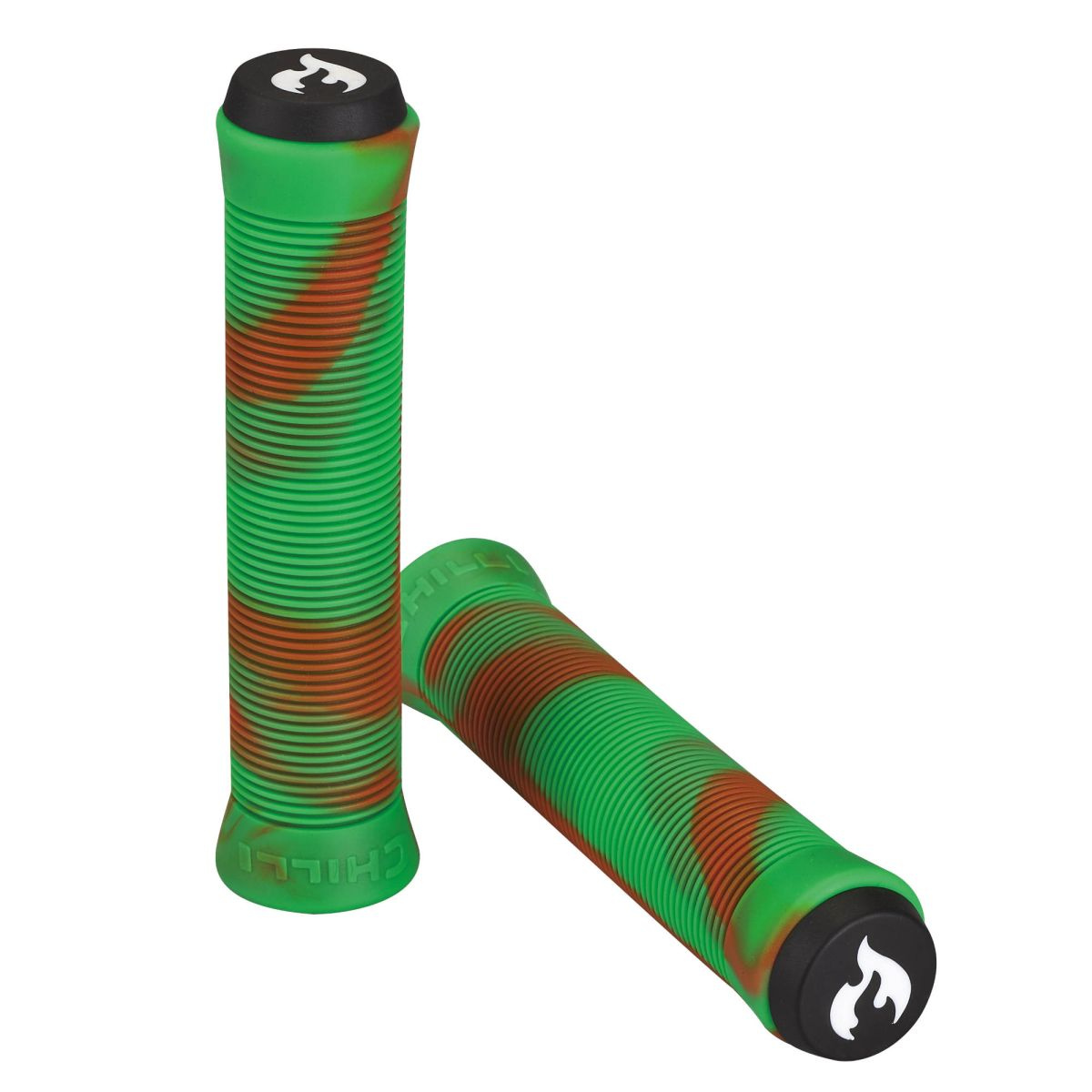 Gripy Chilli Standard 2.0 o délce 14 cm v kombinaci zelené a oranžové jsou vyrobeny z měkčené gumy, která poskytuje jezdcům pevný a pohodlný úchop při každém triku.