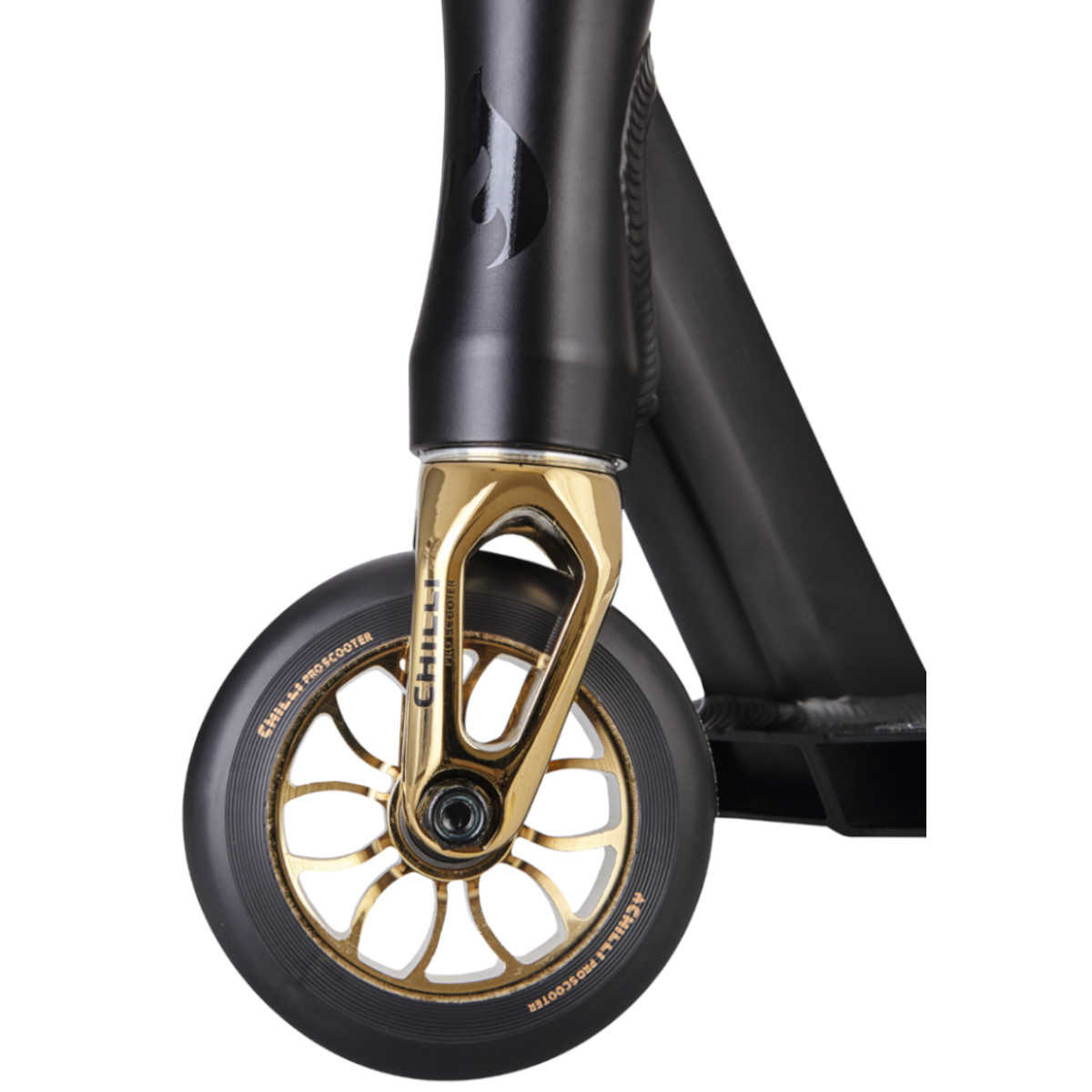Chilli Reaper Crown je skvělá všestranná prémiová freestyle koloběžka v černé barvě a zlatými doplňky s bezkonkurenčním poměrem cena/výkon. Je určená pro začátečníky i středně pokročilé jezdce. Oproti běžným modelům Chilli Reaper je tato koloběžka osazena prémiovou objímkou, vidlicí a středy koleček ve vysokém lesku a chromové barvě. koloběžka Reaper je extrémně robustní a přesto dostatečně lehká, aby snadno zvládla všechny potřebné triky ve své kategorii.