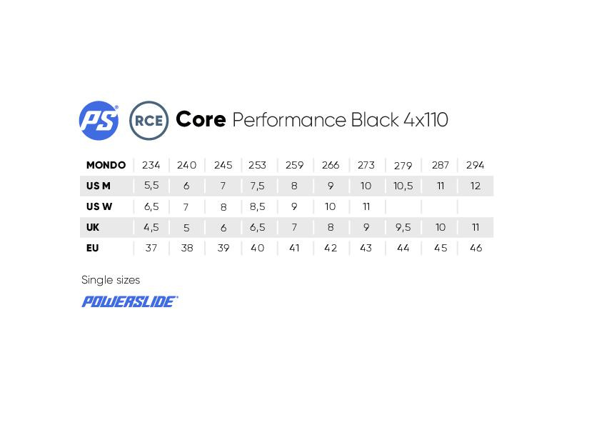 Neuvěřitelná rychlost a výkon za cenově dostupnou cenu, to je Powerslide Core Performance Black 4x110, ideální inline speedskate pro mladé bruslaře. Performance Black 4x110 je vynikající volba, která vám poskytne vysoké vlastnosti, které nenajdete u jiných začátečnických speedskate bruslí. Tato vysokovýkonná brusle zahrnuje technologie z Powerslide’s závodní 3X série inline závodních bruslí. Lehká a reaktivní, Core Performance Black 4x110 má skelet vyrobený z kombinace basaltu a skleněných vláken, což ji činí odolnou a reaktivní. Horní část boty je vyrobena z mikrovlákna a nano-grade kůže, která poskytuje těsné, pohodlné uchycení a zlepšuje kontrolu. Navrženo kolem spolehlivé 195mm montáže, brusle je vybavena Core Performance rámem, rychlými 4x110mm Infinity koly a hladce běžícími WICKED ABEC 9 ložisky. Rychlé, reaktivní, pohodlné a cenově dostupné – není třeba dělat kompromisy, když závodíte na Core Performance Black 4x110.