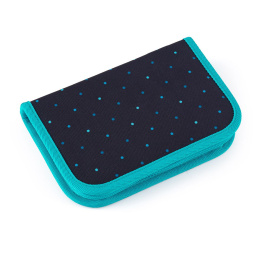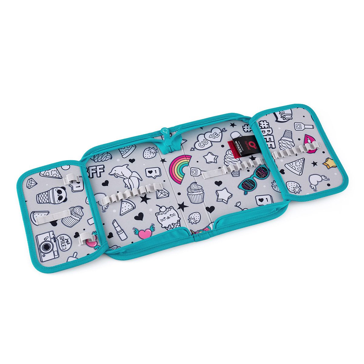 Jednopatrové školní pouzdro se dvěma klopami. Díky gumovým úchytům se do nich vejde celkem dvacetjedna pastelek, tužek a fixek. Tři širší úchyty poslouží na pravítko, kružítko či nůžky. Dva větší na gumu a ořezávátko.