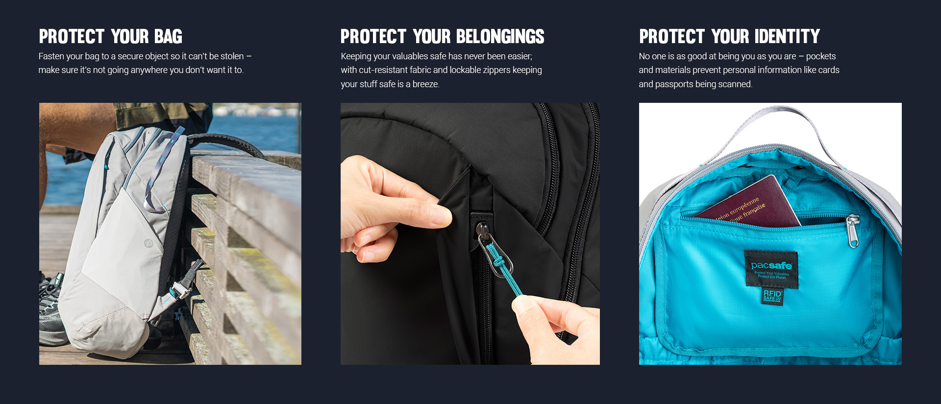 Jeden z popruhů připevňuje k tělu batohu TurnNLock zabezpečená karabina. batoh tak můžete přivázat třeba k topení, stolu, či zábradlí a ukotvit ho proti odnesení. Zipy chrání proti rozepnutí nový systém Secure dock lock a Zip clip. Hlavní popruh Carrysafe® je proti proříznutí vyztužen vetkaným lankem z Dyneema®. Pokusy o proříznutí těla batohu hravě překazí eXomesh® slashguard - našitá síť z ocelových lanek. RFIDsafe™ kaspy zabraňující nechtěnému skenování vašich osobních údajů a zneužití platebních karet.