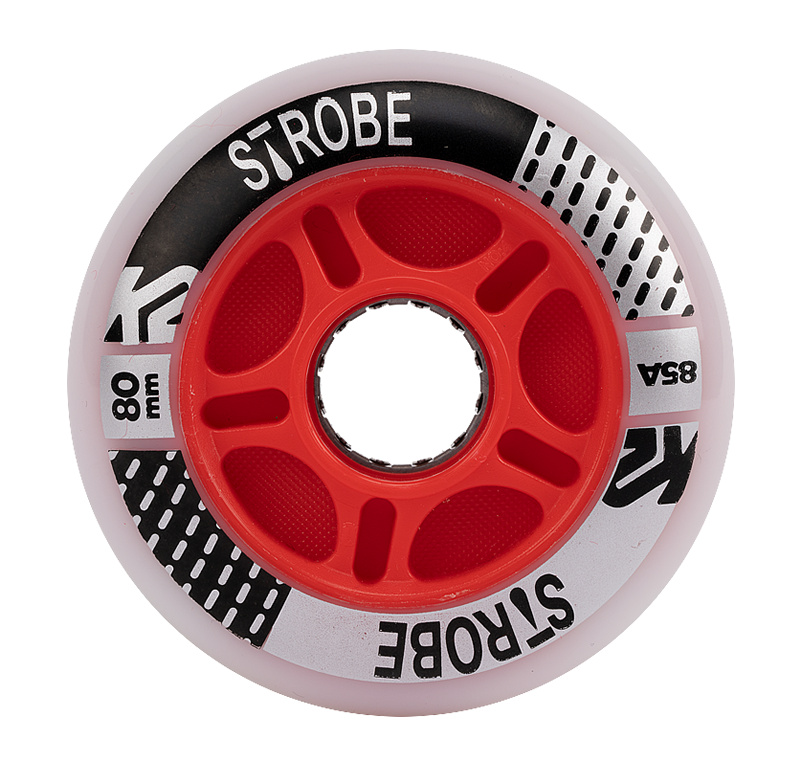 The K2 Strobe light-up inline wheels, size 80 mm and hardness 85A. These wheels match the quality of original K2 catalog models and feature a solid five-spoke core. The high-quality urethane compound ensures excellent ride performance and durability. The wheels light up red and are powered by magnetic spacers.