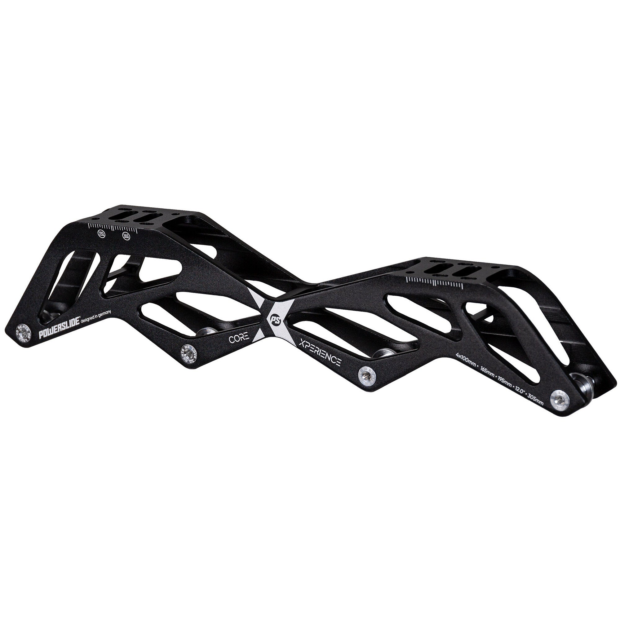 To further enhance the convenience for inline racers, the Powerslide Core X-perience 100 - 12.0" frame incorporates the trustworthy 195 and 165 mounting standard. This feature simplifies the fitting process, making it effortless to pair the frame with a wide selection of boots, ensuring a customized and comfortable fit for every racer.