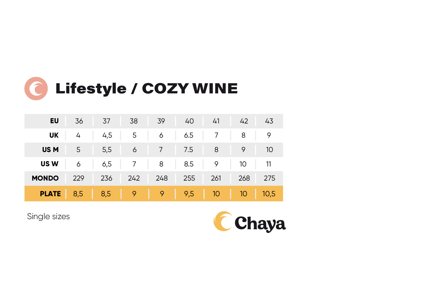 The Chaya Cozy Wine roller skate boasts a Galaxy Evo cast aluminum plate equipped with the PTS (Power Toe System) which which follows the natural shape of the boot giving you excellent responsiveness, stability, and control, empowering you to take your skating skills to new heights. Roll with speed and confidence on the Sugar Rush 59mm/78A outdoor wheels and WICKED ABEC 9 bearings; effortlessly glide over any terrain, and embrace a smooth and exhilarating ride every time. Dance, skate, cruise - express yourself and make a bold statement in Chaya Cozy Wine roller skate made of 100% vegan friendly materials.
