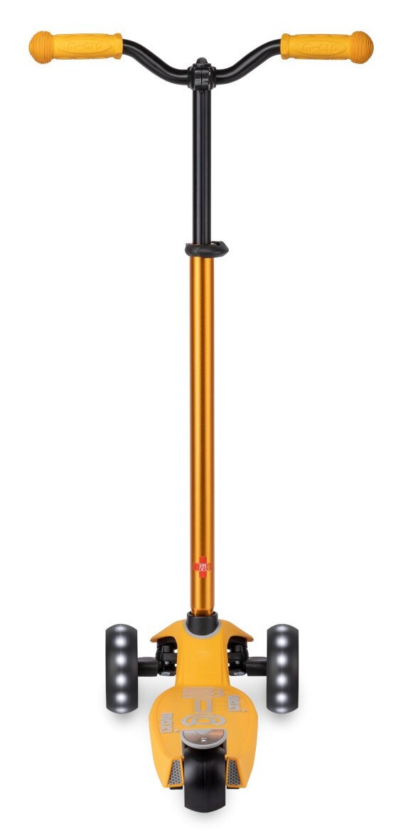 Dětská koloběžka Micro Maxi DeLuxe LED je bezpečná, stabilní a zábavná koloběžka určená pro starší děti, juniory a teenagery s doporučenou nosností do 50 kg. koloběžka zlepšuje rovnováhu, koordinaci a motorické dovednosti, jež napomůžou k přechodu na kolo či jiné prostředky. Hlavními přednostmi je speciální patentovaný mechanismu, který zatáčí nakláněním řídící tyče a lehkým přenesením rovnováhy, křídlová řídítka do tvaru V, přední svíticí kolečka, polohovatelná řídítka, výškově nastavitelná řídící tyč, vysoká stabilita pomocí 3 koleček a nízká váha.