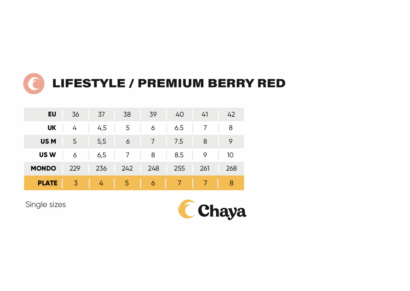 The boot is mounted to the Chaya Zena 6061 aircraft-grade aluminum plate with Chaya "Standard" cast trucks, giving you an extremely snappy and responsive feel. Completing this incredible package are Chaya Mellows 62mmx38mm/78A outdoor wheels and WICKED ABEC 9 freespin bearings, Jelly interlock cushions, and Chaya Cherry Bomb toe stops. The Chaya Melrose Premium Berry Red is a stylish, capable, comfortable lifestyle roller skate that will have you skating all day and all night and loving every second of it.