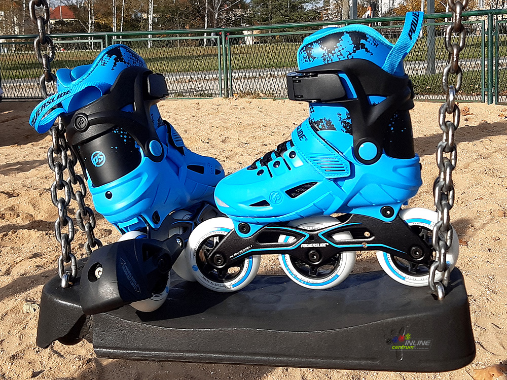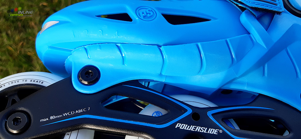 Chassis AL 3D Stamped is light, equipped with wheels Powerslide with size 80mm, 84mm and 90mm (in connection with size of skatesú, hardness 82A and bearings WCD ABEC 7. Shoe is anatomically padded for children´s leg, comfortable, from outer side made by plastic skelet and synthetic skin. Angles of tightening elements and joint are perfectly set to help to have higher comfort by saving solid and sure tightening of leg. This offered support prevents from losses of energy when you skate.