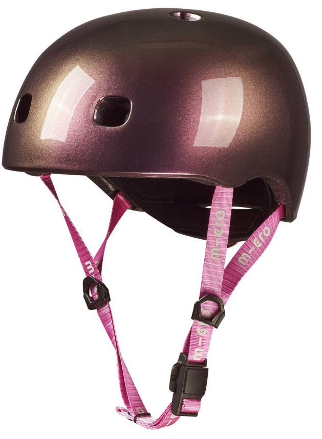Bezpečná a lehká helma značky Micro s nastavitelnou velikostí pomocí upínacího kolečka. Jedná se o helmu růžové barvy v neochromovém (duhovém) dekoru.