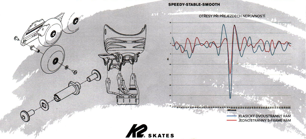 Unikátní jednostranný rám K2 Vo2-S má letmé zavěšení koleček, díky kterému je schopen pohltit až o 20% více vibrací a otřesů z jízdy než jeho předchůdce. Zároveň díky jednostranné konstrukci byla snížena váha podvozku na polovinu. Jízda na Vo2 modelech bude nyní ještě hladší a zábavnější. Frame je vyroben z vysoce kvalitní slitiny hliníku, což zaručuje nízkou váhu a vysokou tuhost zajišťující ty nejlepší jízdní vlastnosti.