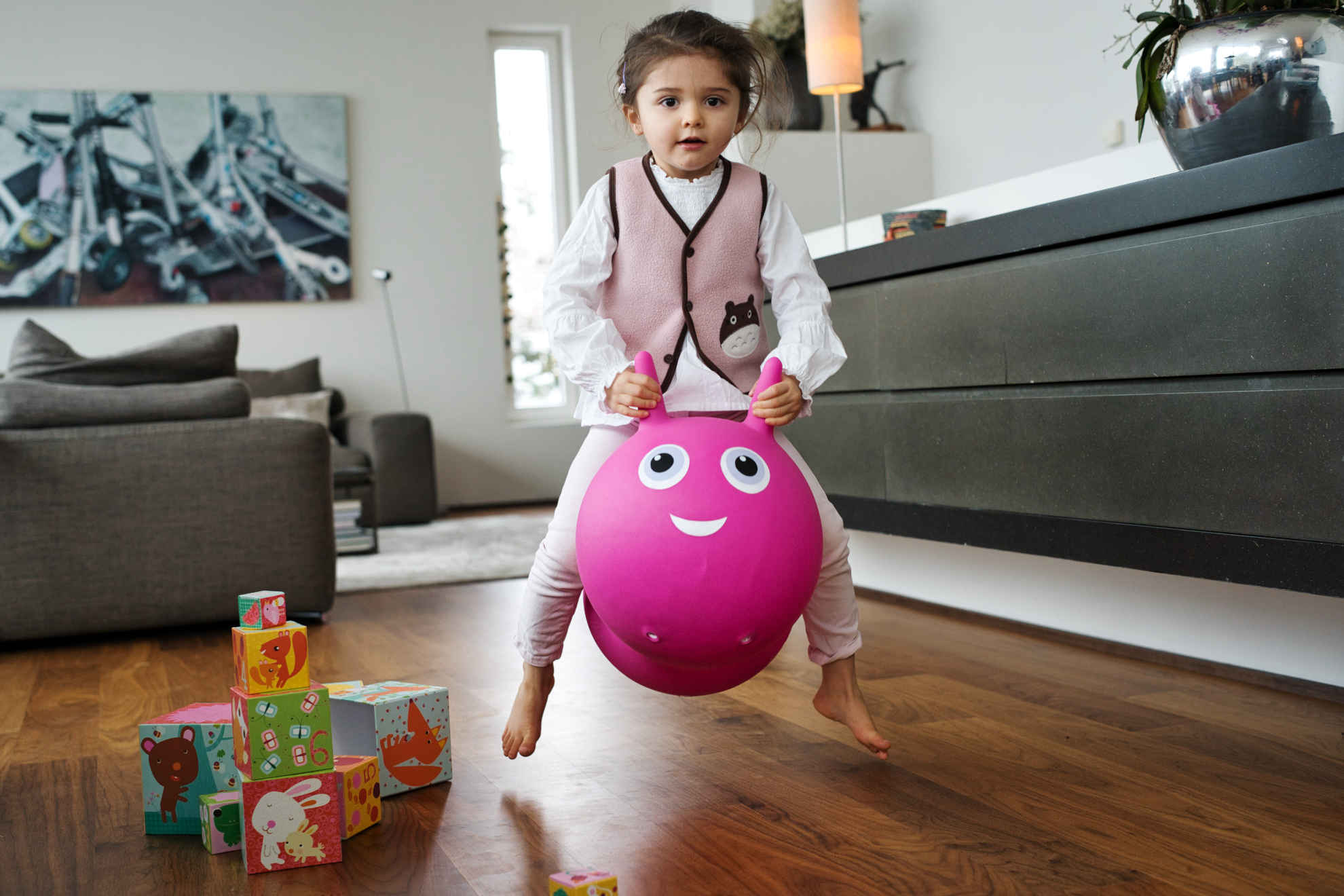 Skákací míč může být naplněn více či méně vzduchem, v závislosti na velikosti dítěte, aby bylo vaše dítě vždy v bezpečí a pohodlí.
