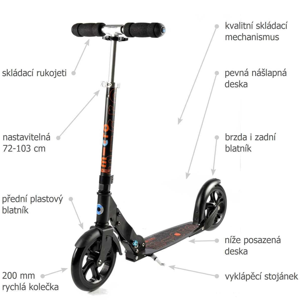 Skládací koloběžka Micro Black představuje esteticky laděnou a vysoce elegantní skládací koloběžku pro maximální jízdní zážitek. Díky své černé barvě je velice oblíbená, jak u mužů tak i u žen. Hlavními přednostmi této koloběžky jsou větší kolečka o velikosti 200mm, pevná nášlapná deska a skládací řídítka.