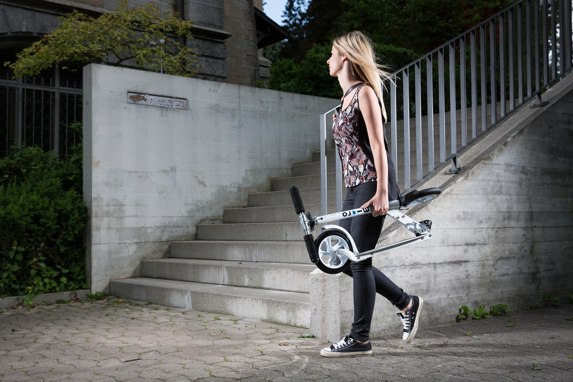 I přes vysokou odolnost je koloběžka lehká. Hmotnost koloběžky je 4,7 kg díky čemuž je vhodná i na přesuny po městě.
