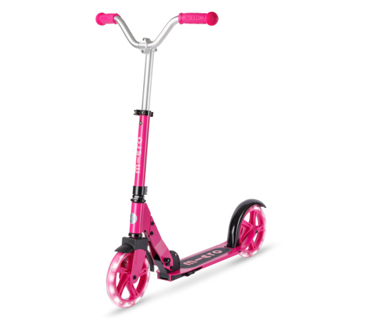 Dětská skládací koloběžka Micro Cruiser v tmavě růžové barvě je vybavena 200 mm LED svítícími kolečky v barvě koloběžky. koloběžka je určena pro děti ve věku přibližně 5-12 let.