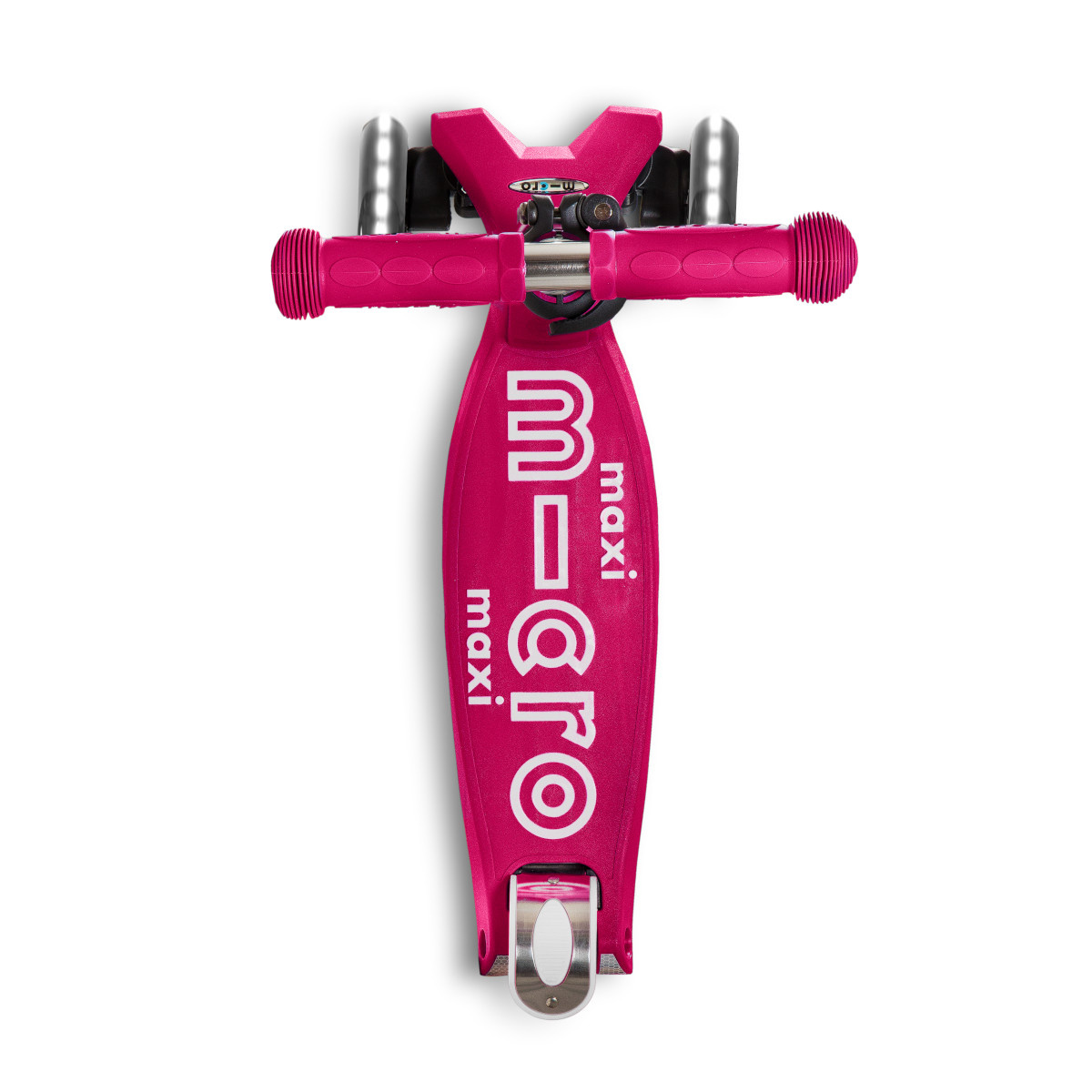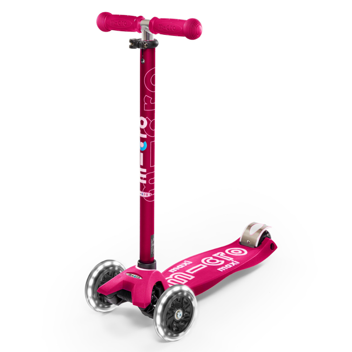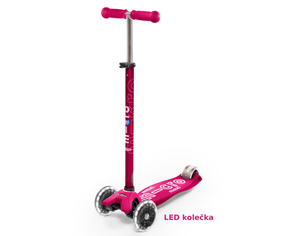 Dětská koloběžka Micro Maxi DeLuxe LED je bezpečná, stabilní a zábavná koloběžka, určená pro starší děti, juniory a teenagery s doporučenou nosností do 50 kg. koloběžka zlepšuje rovnováhu, koordinaci a motorické dovednosti, jež napomůžou k přechodu na kolo či jiné prostředky. Hlavními přednostmi je speciální patentovaný mechanismu, který zatáčí nakláněním řídící tyče a lehkým přenesením rovnováhy, výškově nastavitelná řídící tyč, vysoká stabilita pomocí 4 koleček, přední svítící kolečka a nízká váha.