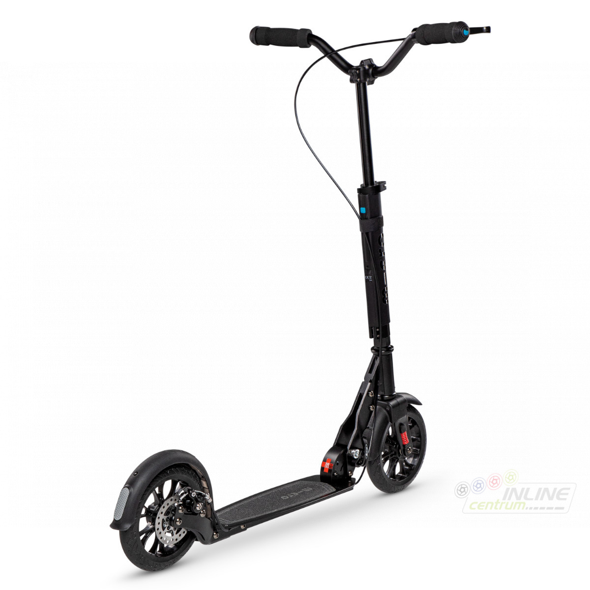 koloběžka je osazena prodlouženou zadní blatníkovou brzdou s reflexními prvky a především kvalitní zadní kotoučovou brzdou na rukojeti. brzda je vyměnitelná.