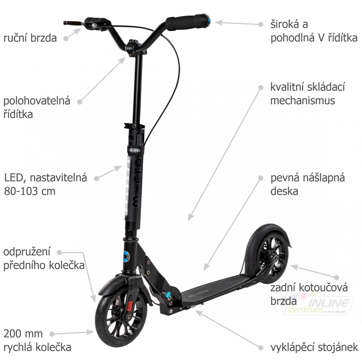 Odpružená skládací koloběžka s ruční brzdou Micro Metropolitan DeLuxe Black je speciální pevnou nášlapnou deskou, širokými tvarovanými řídítky, které nejdou skládat, odpruženým předním kolečkem, integrovaným LED světlem v řídící tyči a kvalitní zadní kotoučová brzda, která se ovládá černou hliníkovou páčkou na rukojeti.