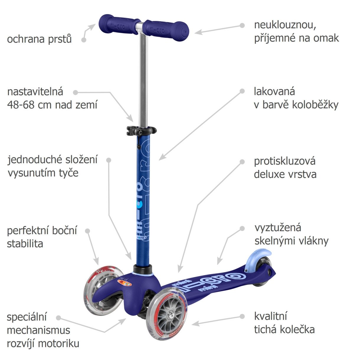 Dětská koloběžka Micro Mini DeLuxe byla vyvinuta ve spolupráci se švýcarskými lékařskými experty a je určená předškolním dětem ve věku cca od 2 do 5 let. koloběžka zlepšuje rovnováhu, koordinaci a motorické dovednosti, jež napomůžou k přechodu na kolo či jiné prostředky. Hlavními přednostmi je speciální patentovaný mechanismu, který zatáčí nakláněním řídící tyče a lehkým přenesením rovnováhy, výškově nastavitelná řídící tyč, vysoká stabilita pomocí 3 koleček a velice nízká váha.