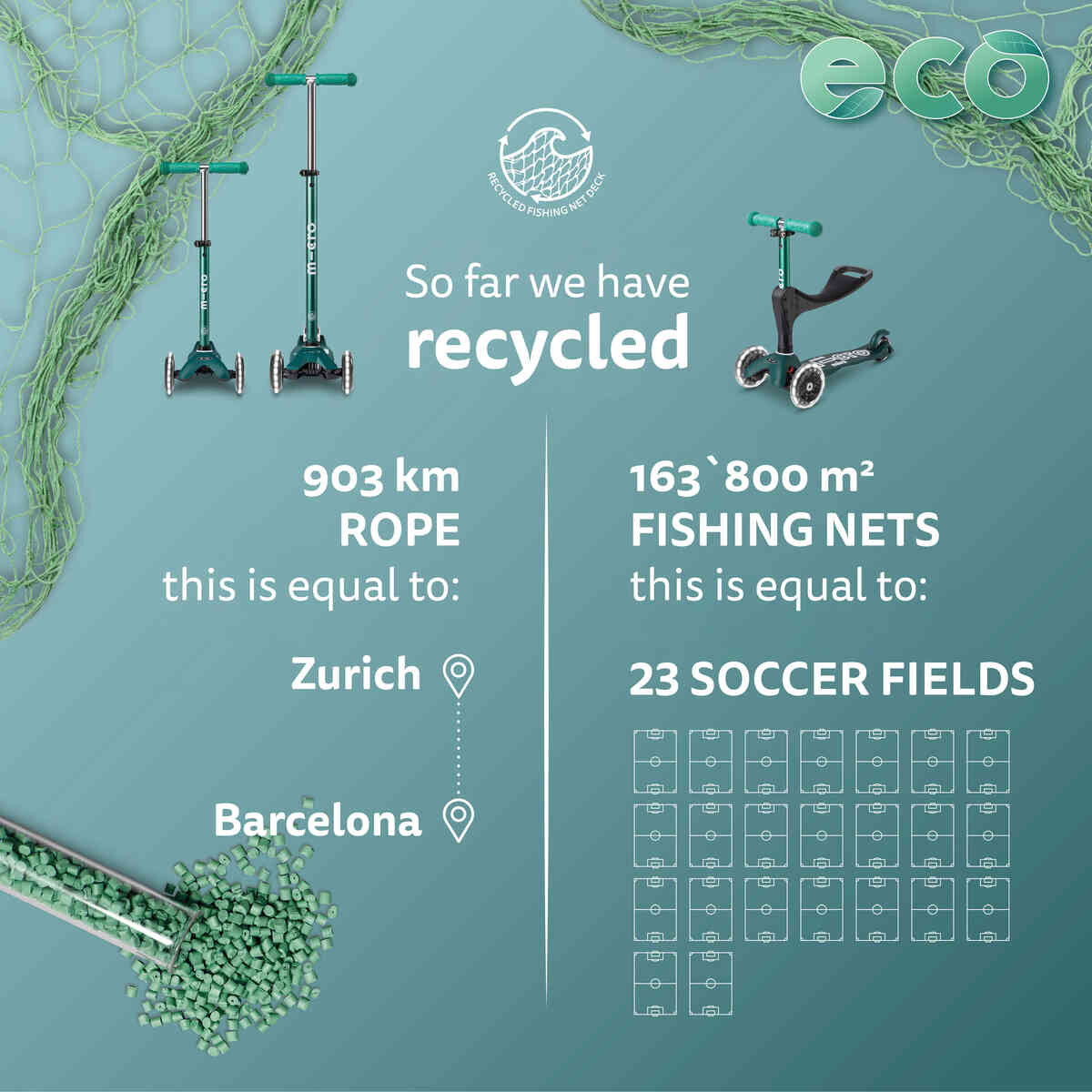 Nášlapná deska je vyrobena z recyklovaného rybářského vybavení, lan a dalšího plastového odpadu z námořního průmyslu. Zároveň je vyztužená skelnými vlákny a na horní straně má z bezpečnostních důvodů protiskluzovou vrstvu. Všechny hrany desky jsou zaoblené, čímž předcházejí zranění při manipulaci. V zadní části desky je nad zadním kolečkem nášlapná brzda a reflexní prvky.