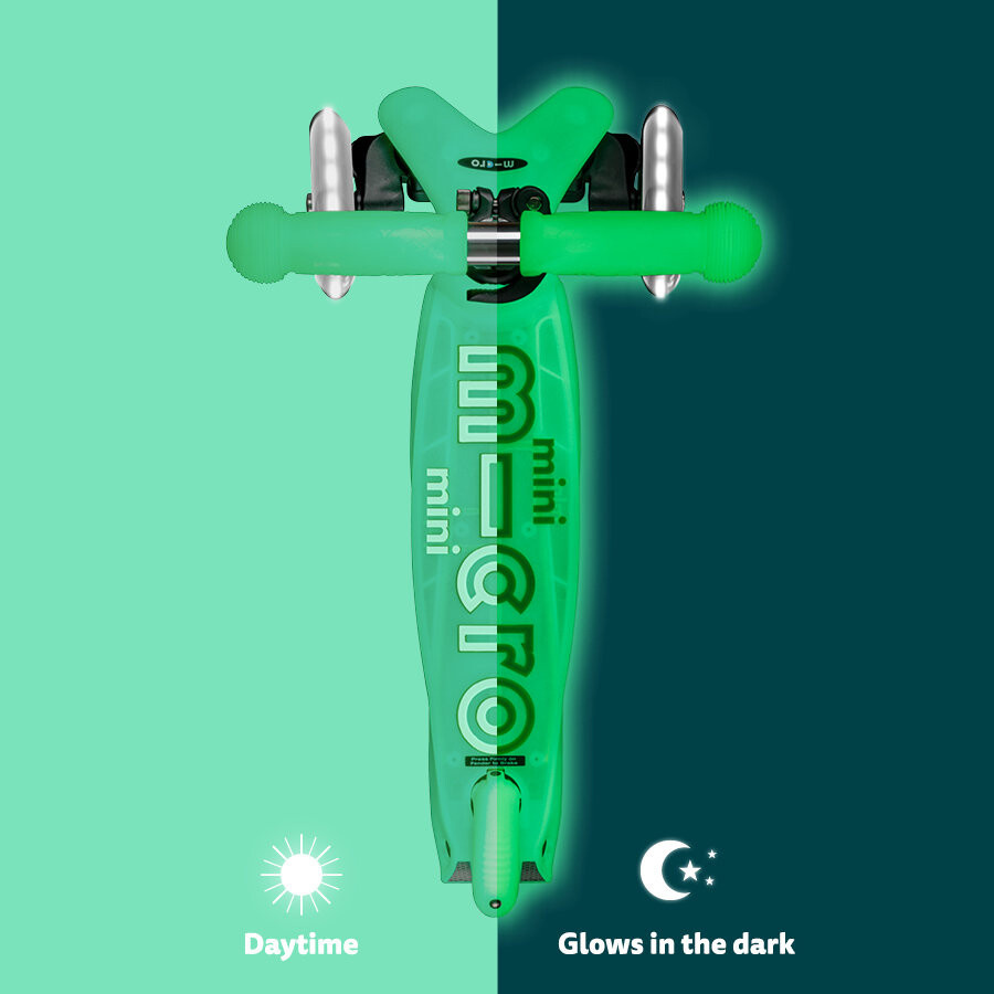 Dětská koloběžka Micro Mini DeLuxe byla vyvinuta ve spolupráci se švýcarskými lékařskými experty a je určená předškolním dětem ve věku cca od 2 do 5 let. koloběžka zlepšuje rovnováhu, koordinaci a motorické dovednosti, jež napomůžou k přechodu na kolo či jiné prostředky. Hlavními přednostmi je speciální patentovaný mechanismu, který zatáčí nakláněním řídící tyče a lehkým přenesením rovnováhy, výškově nastavitelná řídící tyč, vysoká stabilita pomocí 3 koleček, 2 přední LED kolečka a velice nízká váha. Nášlapná deska, rukojeti řídítek, brzda i nápis Micro na řídítkové tyči se během dne nabíjejí slunečním zářením nebo umělým UV světlem a po setmění jemně září.