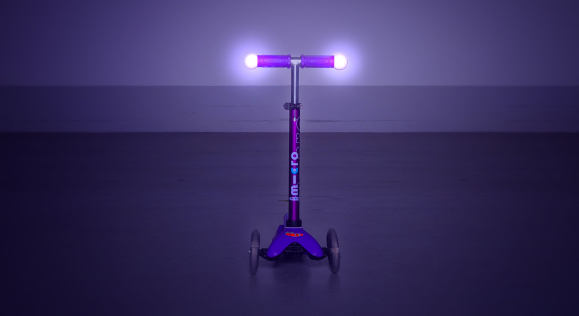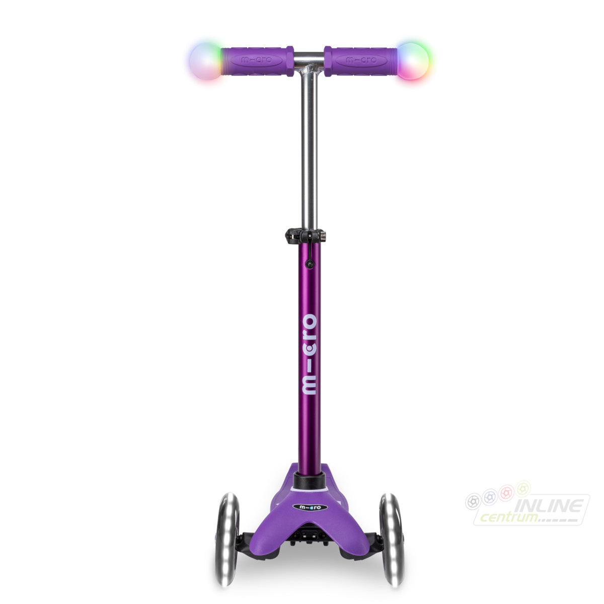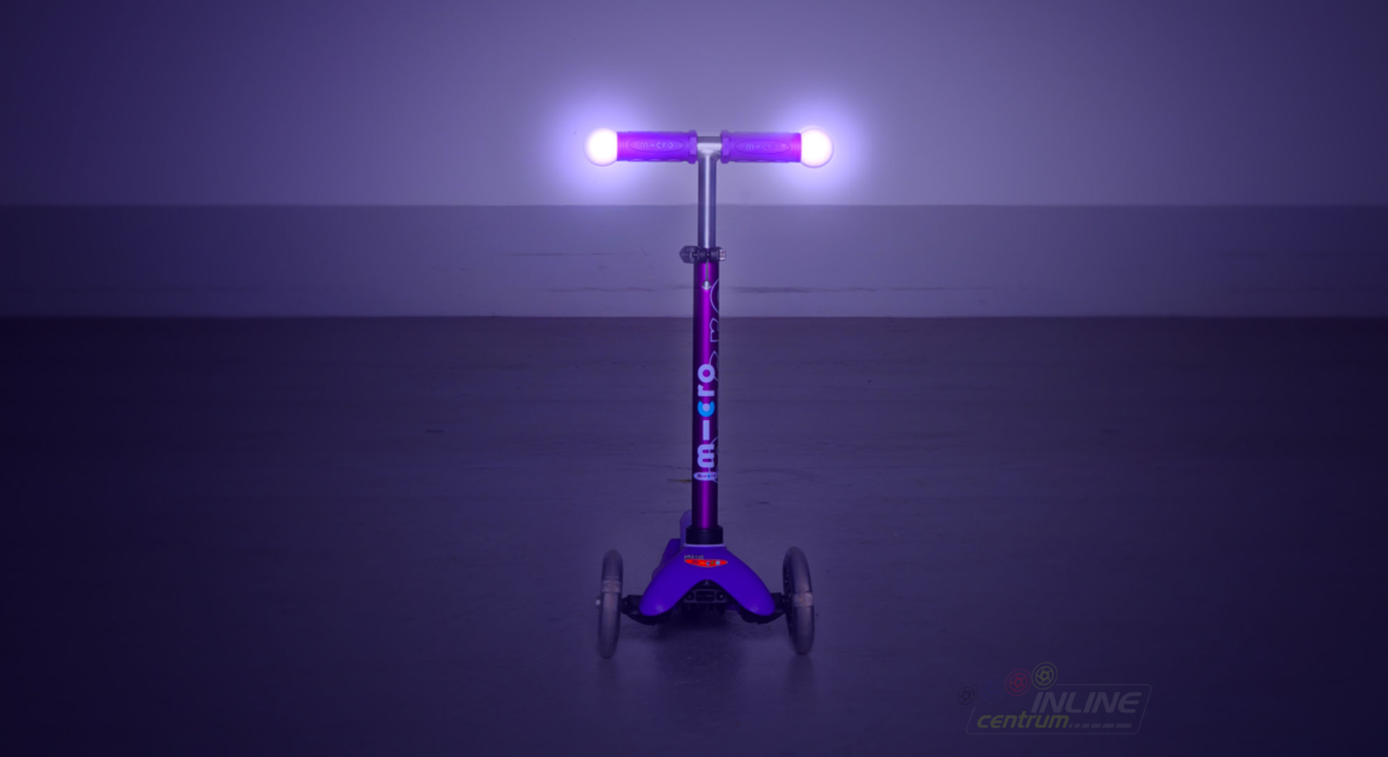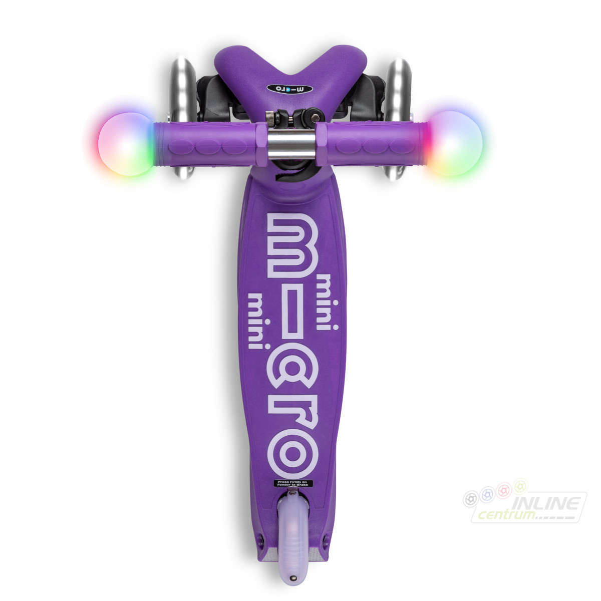 Fialová svítící dětská koloběžka Micro Mini DeLuxe je navržena ve Švýcarsku a je zárukou kvality a dlouhé životnosti.