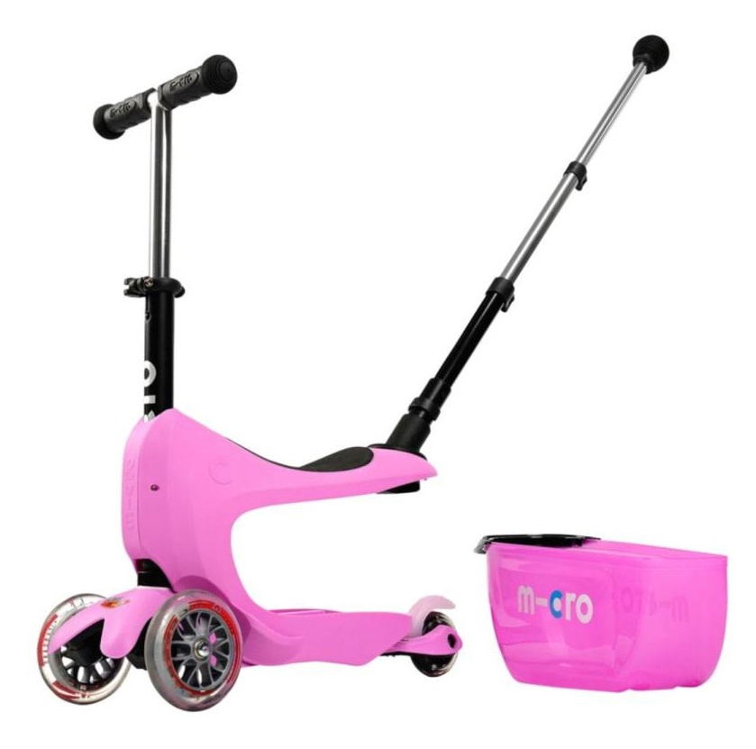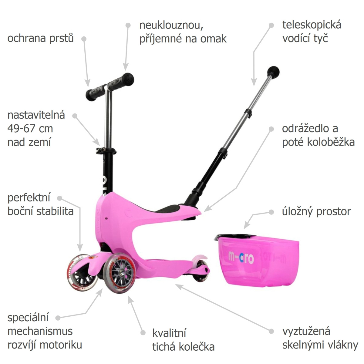 Dětská koloběžka Micro Mini2Go DeLuxe byla vyvinuta ve spolupráci se švýcarskými lékařskými experty a je určená předškolním dětem ve věku cca od 1,5 do 5 let. koloběžka zlepšuje rovnováhu, koordinaci a motorické dovednosti, jež napomůžou k přechodu na kolo či jiné prostředky. Hlavními přednostmi je speciální patentovaný mechanismu, který zatáčí nakláněním řídící tyče a lehkým přenesením rovnováhy, kapotový sedák, který lze z koloběžky odmontovat, zadní vodící tyč, díky které můžete převzít kontrolu nad trojkolkou, výškově nastavitelná řídící tyč, vysoká stabilita pomocí 3 koleček a velice nízká váha.