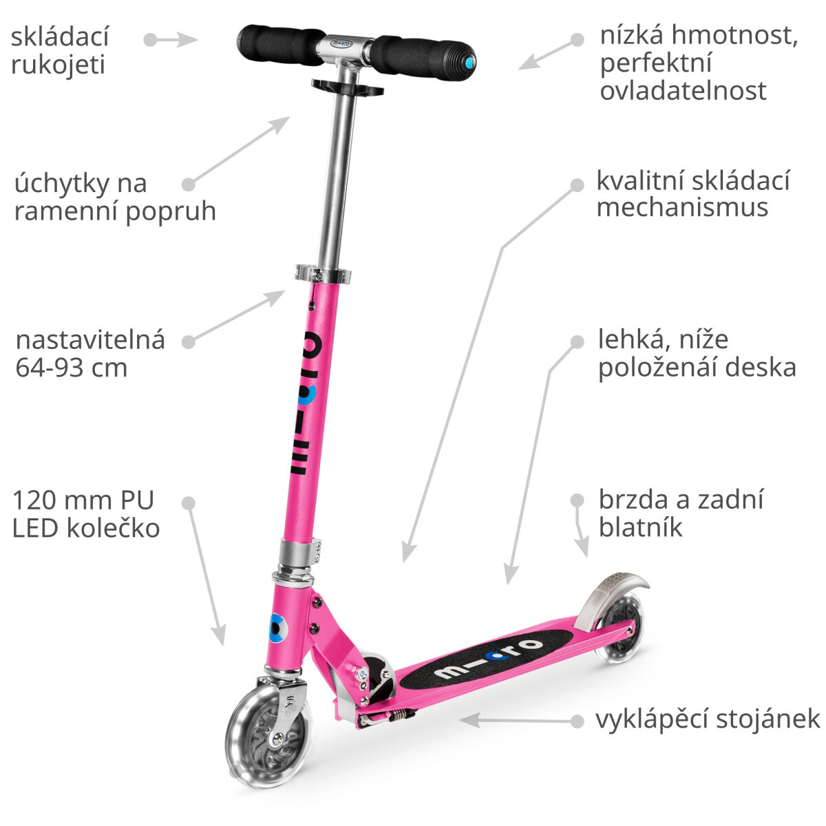 Skládací koloběžka Micro Sprite je jedna z nejkvalitnějších koloběžek pro děti. Je vhodná pro malé i velké děti až po dospělé. Jedná se o ideální koloběžku pro děti, které vyrostly z menších koloběžek se třemi kolečky a chtějí přestoupit na koloběžku se dvěma kolečky. Hlavními přednostmi této koloběžky jsou nízká váha, snadné složení, větší přední kolečko pro snadnější přejezdy nerovností a menší zadní kolečko. Díky tomu je nášlapná deska koloběžky Sprite posazená níže pro lepší stabilitu. Tato kolečka jsou navíc svítící, nepotřebují baterii a začnou svítit ve chvíli, kdy se koloběžka rozjede.
