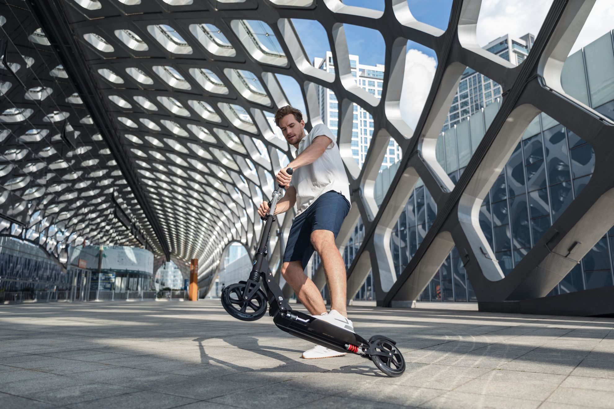 Kvalitní skládací mechanismus umožní spolehlivé a snadné složení a rozložení koloběžky. Ke složení je nutné stisknout oba čudlíky po stranách skládacího mechanismu. Pro rozložení pak jenom čudlík na pravé straně.