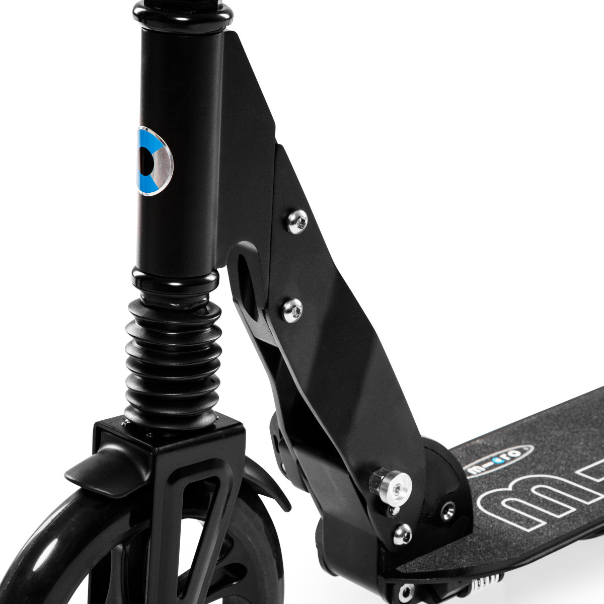 Černá odpružená koloběžka Micro Suspension je navržena ve Švýcarsku a je zárukou kvality a dlouhé životnosti.