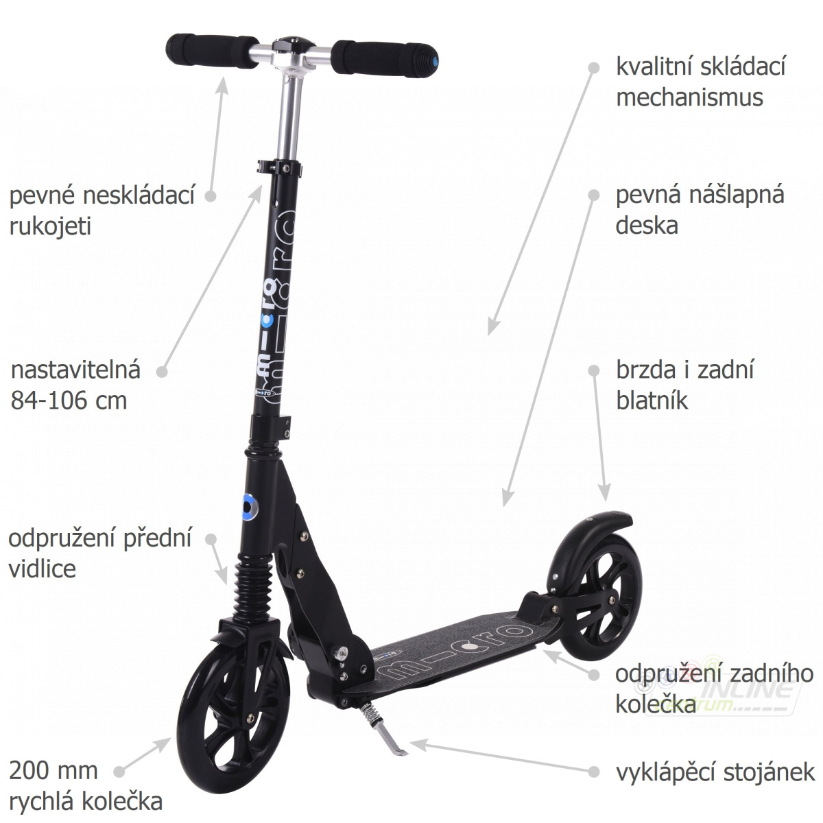 Skládací koloběžka Micro Suspension je unikátní celoodpružená skládací koloběžka. Hlavními přednostmi této koloběžky jsou kolečka o velikosti 200 mm určená pro svižnou jízdu, pevná nášlapná deska, přední a zadní blatník, pevná řídítka a odpružení předního i zadního kolečka.