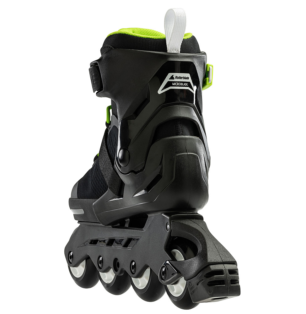 Rostoucí dětské inline brusle Rollerblade Microblade jsou ideální na rekreační projížďky po inline stezkách. Pevná monocoque compositová konstrukce zajišťuje dokonalou oporu kotníků a brusle jsou tak velmi vhodné i pro úplné začátečníky. Compositový skelet je usazený na kolečkách o velikosti 72mm s ložisky SG3. Technologie True Wrap přináší dokonalé obepnutí nohy v brusli. brusle je možné přezout na tříkolečkový set-up 3x80mm. Díky tříkolečkové koncepci budou brusle hravé a skvěle ovladatelné, díky větším kolům zase velmi komfortní. Větší kolečka utlumí více vibrací a snadněji překonají veškeré nerovnosti. Dětské inline brusle Rollerblade lze pouhým stiskem tlačítka nastavit na jinou velikost v rozmezí 4 čísel.