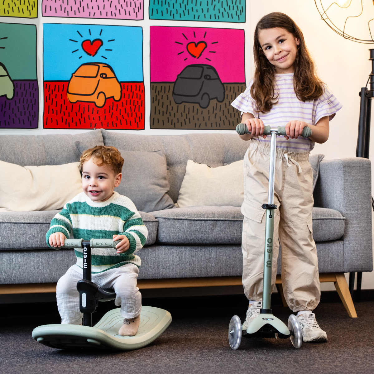 Jedna z konfigurací umožňuje, aby si Mini Micro DeLuxe Rock & Go LED užily dvě děti současně – nejmladší se může houpat, zatímco starší jezdí na koloběžce.