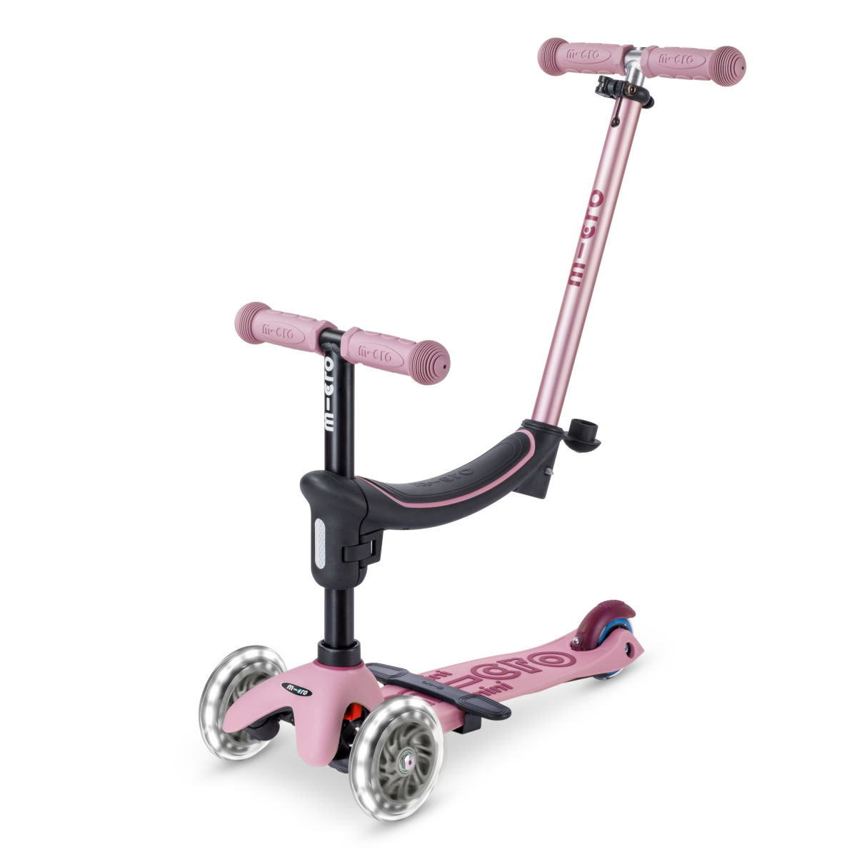 Další konfigurace umožňují využít houpačku s vodicí tyčí, koloběžku se sedlem a vodicí tyčí, koloběžku se sedlem, koloběžku s nízkými řídítky a nakonec originální, roky oceňovanou koloběžku Mini Micro DeLuxe LED s nastavitelnými zvýšenými řídítky.