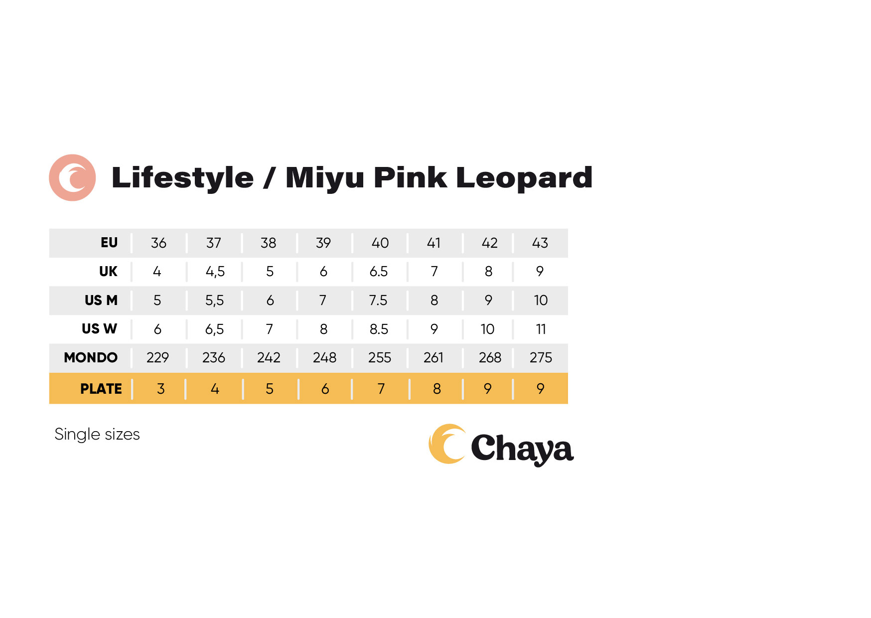 Navrženo tak, aby vydrželo nároky aktivního životního stylu, Chaya Miyu Pink Leopard disponuje TPU svařovaným ochráncem prstů, který vydrží i nejnáročnější bruslařské seance. Bota má dostatečné polstrování, aby zajistila pohodlný fit, aniž by omezovala výkon, a hluboký V-výřez na zadní straně boty poskytuje lepší flexibilitu pro bruslení. Miyu Pink Leopard je vybavena Shari kompozitní deskou, která poskytuje superiorní stabilitu a kontrolu, takže můžete bruslit s jistotou při učení nových triků a technik.