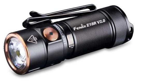 Fenix E18R V2.0 je nabíjecí miniaturní kapesní LED svítilna s krátkodobým extrémním výkonem až 1200 lumenů (ANSI). Tento model používá jako světelný zdroj špičkovou diodu Luminus SST-40. Díky délce pouhých 67 milimetrů a váze 56 gramů (včetně baterie) ji lze nosit stále při sobě - v kapse, na klíčích či v kabelce. Je napájená nabíjecím Li-ion akumulátorem RCR123A, který lze nabíjet ve svítilně přes USB-C konektor z jakékoliv USB zdroje (např. počítač, powerbanka, USB zdroj v autě). Nouzově lze použít i jednorázovou CR123A baterií.