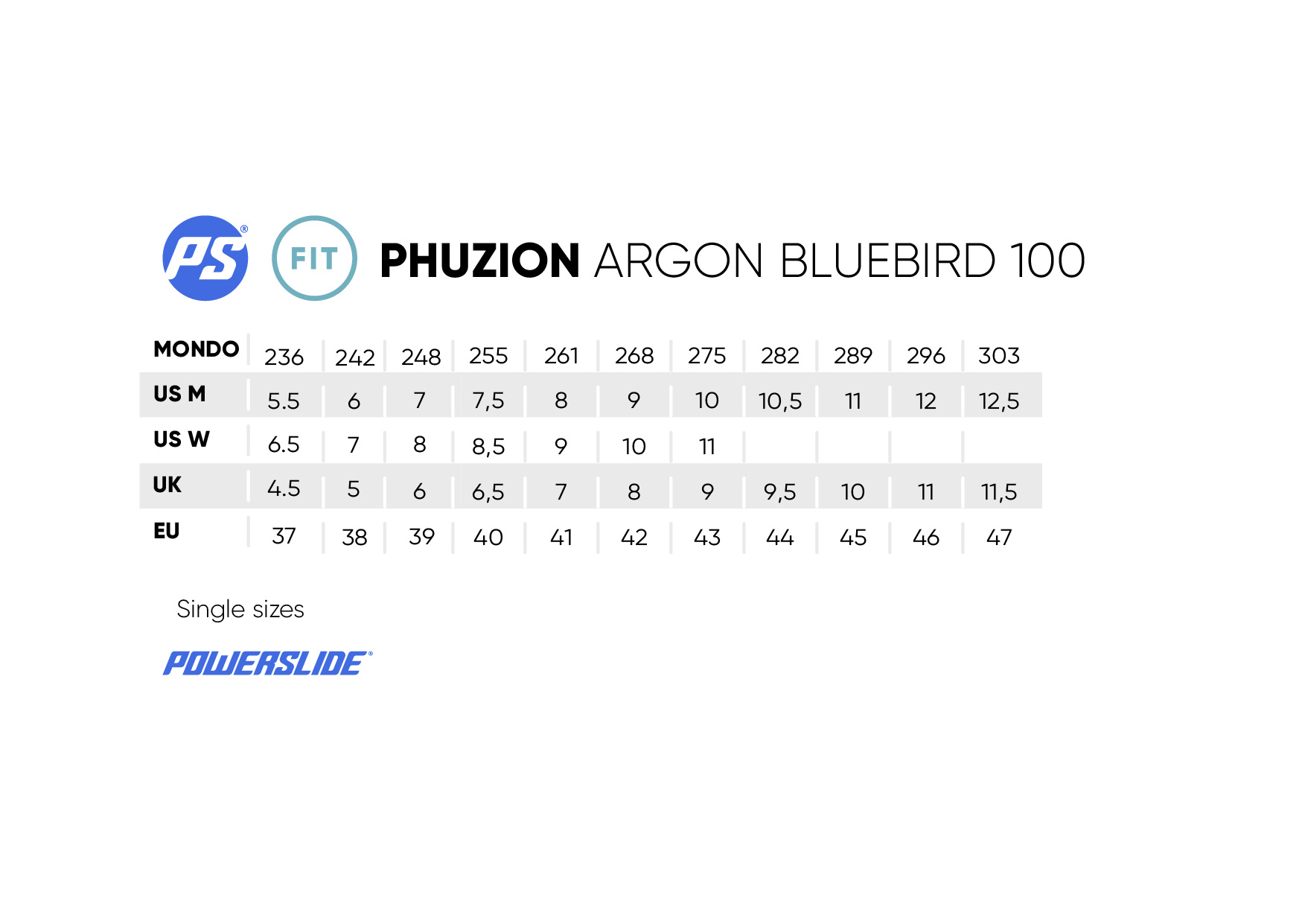 Powerslide PHUZION fitness brusle revolučně změnily inline bruslení a limitovaná edice Argon Bluebird 100 je nejkomfortnější a nejlepší výkonný model PHUZION bruslí. Je to vlajková loď rodiny PHUZION, která obsahuje pouze ty nejlepší materiály a funkce. Skořepina je vyrobena z pevného, lehkého skelnými vlákny vyztuženého plastu, který obsahuje TRINITY montážní systém, jenž zajišťuje nízký střed těžiště, poskytující vynikající kontrolu a stabilitu.