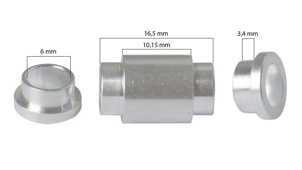 Běžné osazení kolečka spacerem a ložisky. V kolečku jsou vždy dvě ložiska a mezi nimi spacer, v tomto případě 6 mm.
