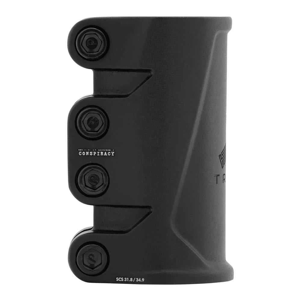 Triad je australská značka složená nejlepšími jezdci po celém světě. Conspiracy je nová modelová řada, kterou navrhnuli a otestovali samotní jezdci. Hmotnost celého SCS je 235 gramů a to právě díky tomu že je vyráběna z kvalitního hliníku 6061 se stupněm pevnosti T6. Do SCS se vám vejdou jak standard (32 mm) tak i oversized (35 mm) řidítka a to právě díky SHIMU, který je součástí balení včetně SCS top capu a kompresního šroubu.