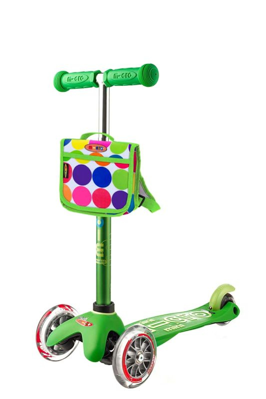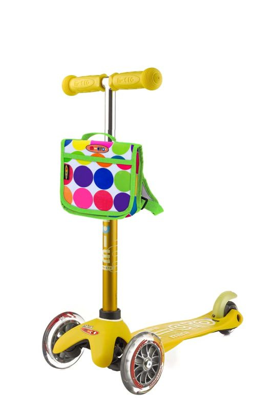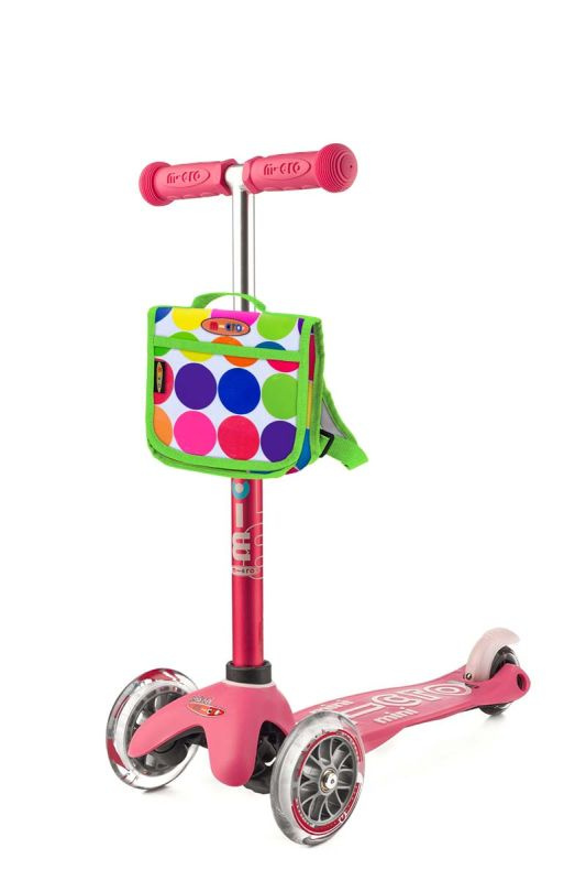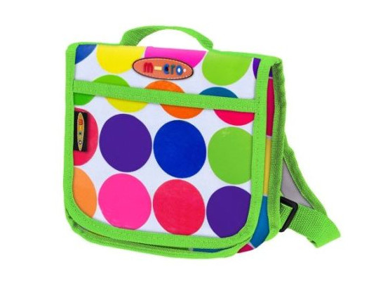 batoh Micro Neon Dot je univerzální dětský batůžek v zelené barvě s tečkami, který je možné zavěsit na řídítka koloběžky nebo trojkolky Micro.