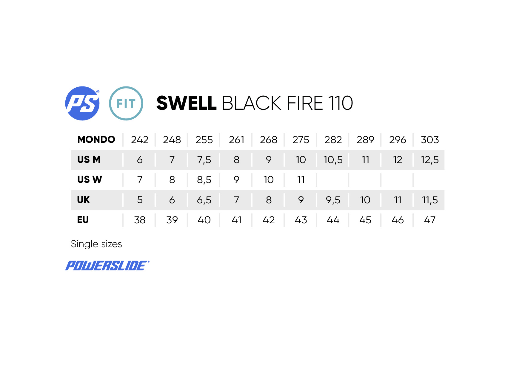 The Powerslide Swell Black Fire is a revolutionary inline skate specially designed for intense fitness training. This skate features our anatomically shaped shell with flex cuts in the ankle area and RECALL fit with memory foam to provide superior comfort and maximum support. The new upper combines our stretchable and ventilated second-skin Powerknit upper with welded TPU reinforcements to increase responsiveness and stability. The high abrasion resistant TPU material protects the toe and side panels against falls and wear and tear increasing the lifespan of the skates to endure even the most demanding pieces of training. TRINITY mount with 3 fixation points will help you reach new levels of performance. For further information visit Swell.Powerslide.com and follow the Swell Skate Club - Facebook: /swellskateclub - Instagram: @swellskateclub