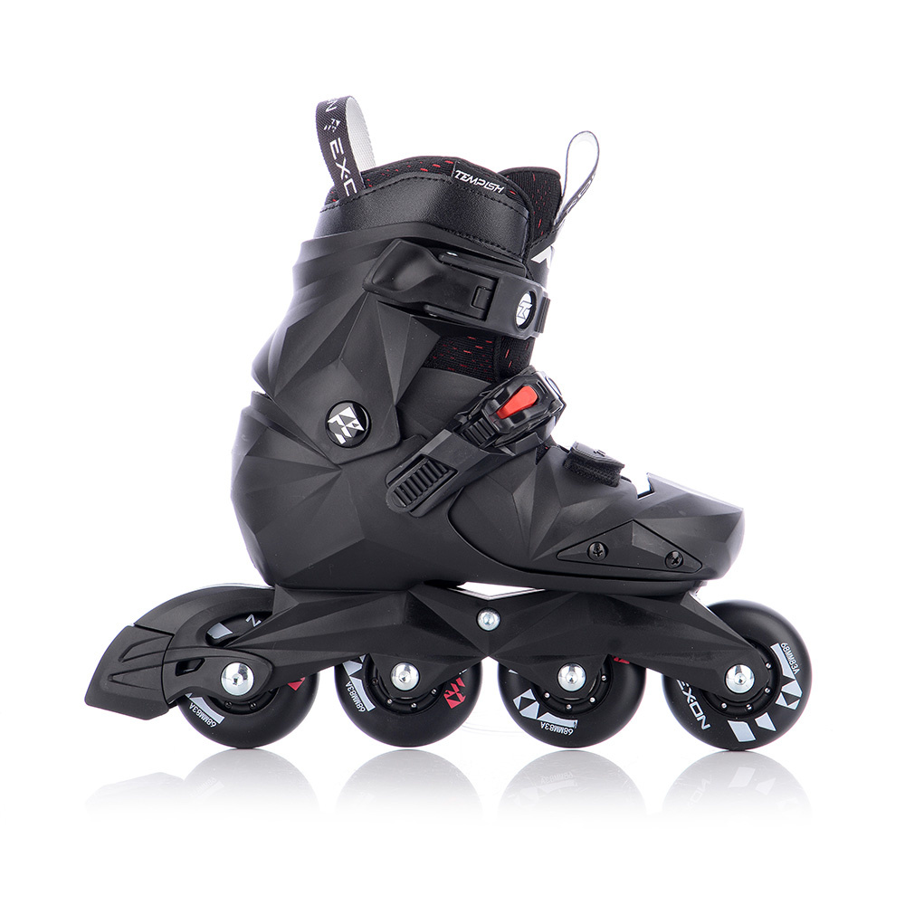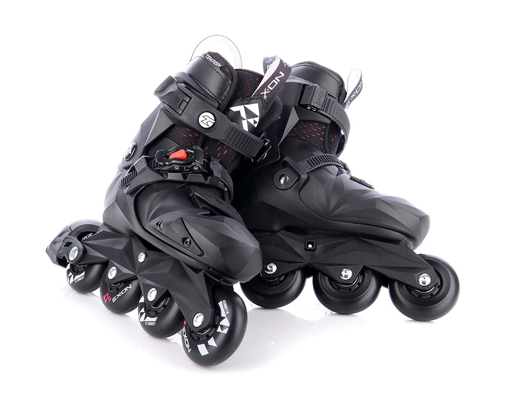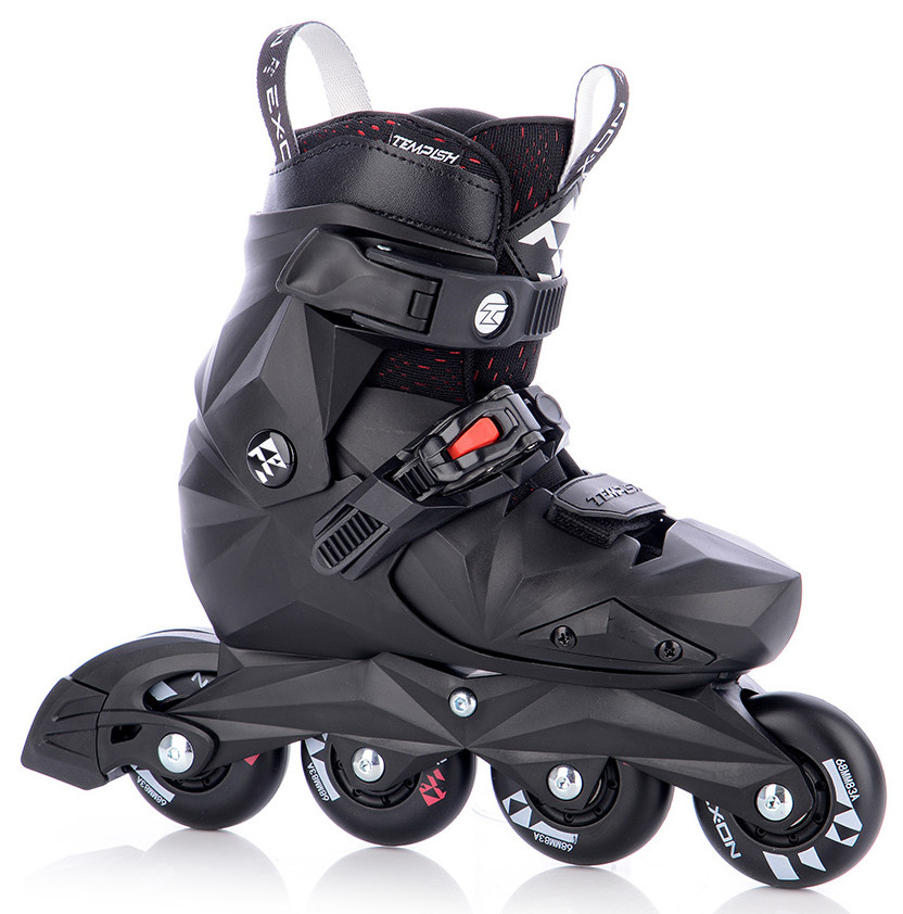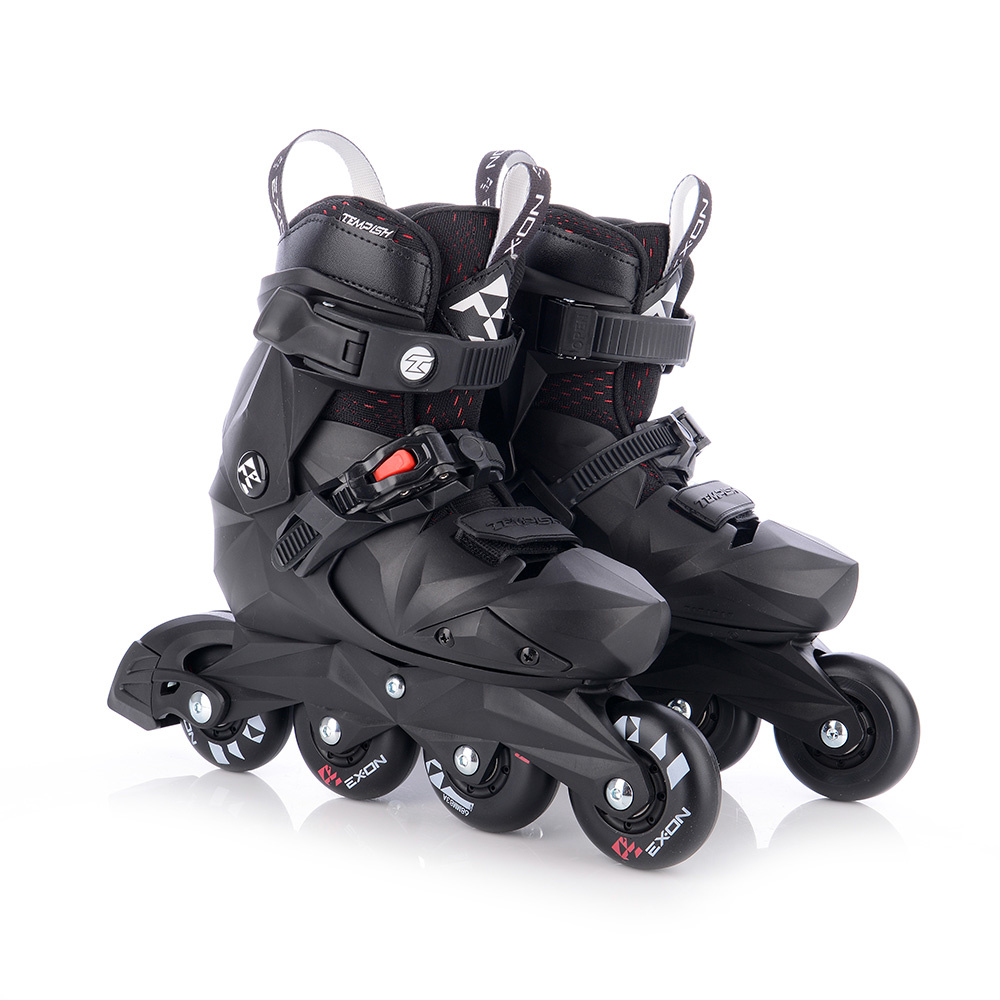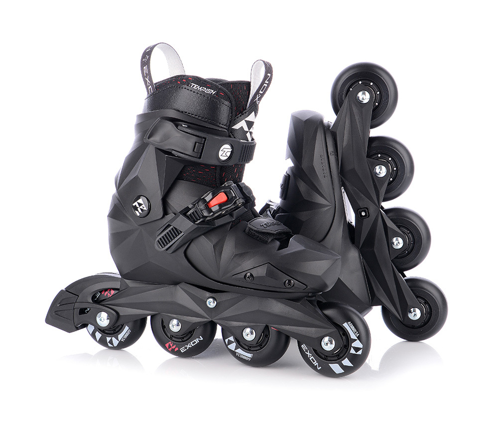 Dětské roztahovací brusle Tempish EXON jsou určené pro sportovní i rekreační bruslení. Střední a vysoká zátěž, vhodné pro začínající i pokročilé bruslaře. brusle mají jednoduchý a pohodlný systém nastavení velikosti pomocí inbusového klíče (vel. 4) na patní části skeletu. Botu je díky tomu možno přenastavit na požadovanou velikost v daném rozmezí po milimetrech, nikoli po celých číslech. Plastový skelet brusle je velmi robustní a poskytuje výraznou oporu při bruslení. Mezi druhým a třetím kolečkem se nachází mechanismus pro nastavitelné zpomalování rychlosti bruslení, díky čemuž se děti mohou postupně zdokonalovat a učit se bruslit. Vnitřní botička (liner) je silně vyztužen a bohatě polstrovaný. Nártový pásek je s mikropřezkou, která zajistí pevné dotažení a usazení chodidla v botě. Vnější nártové chrániče jsou připevněny dvěma šroubky a při poškození je možno je vyměnit.