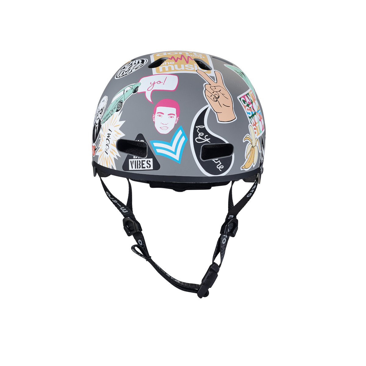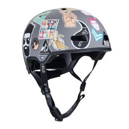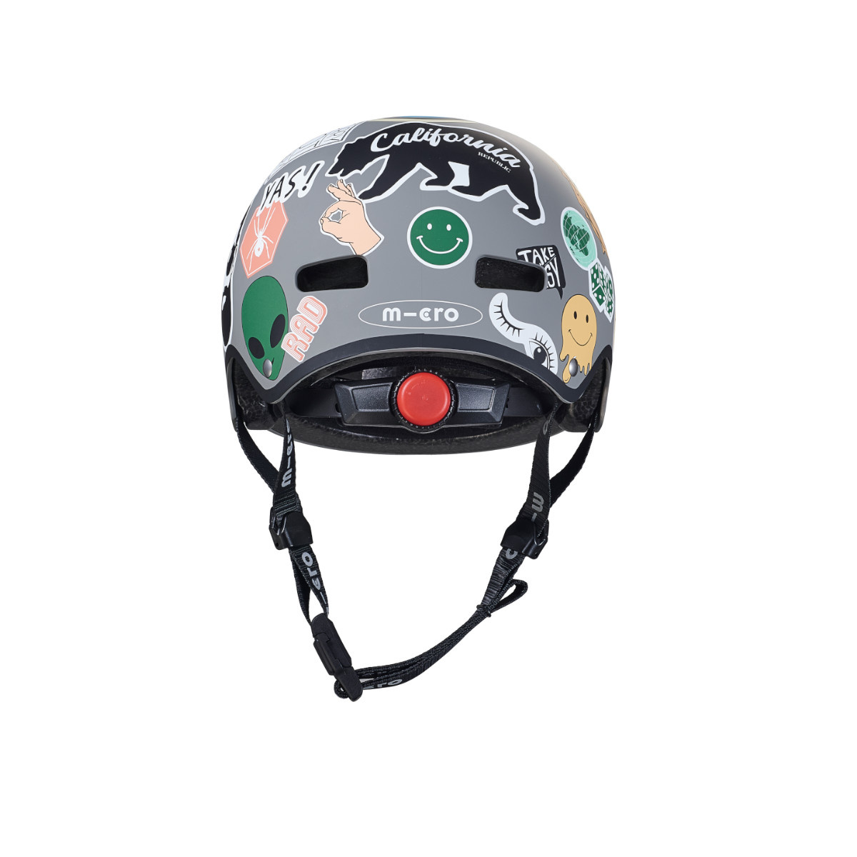 Bezpečná helma značky Micro s nastavitelnou velikostí pomocí upínacího kolečka. Jedná se o helmu s designem samolepek.