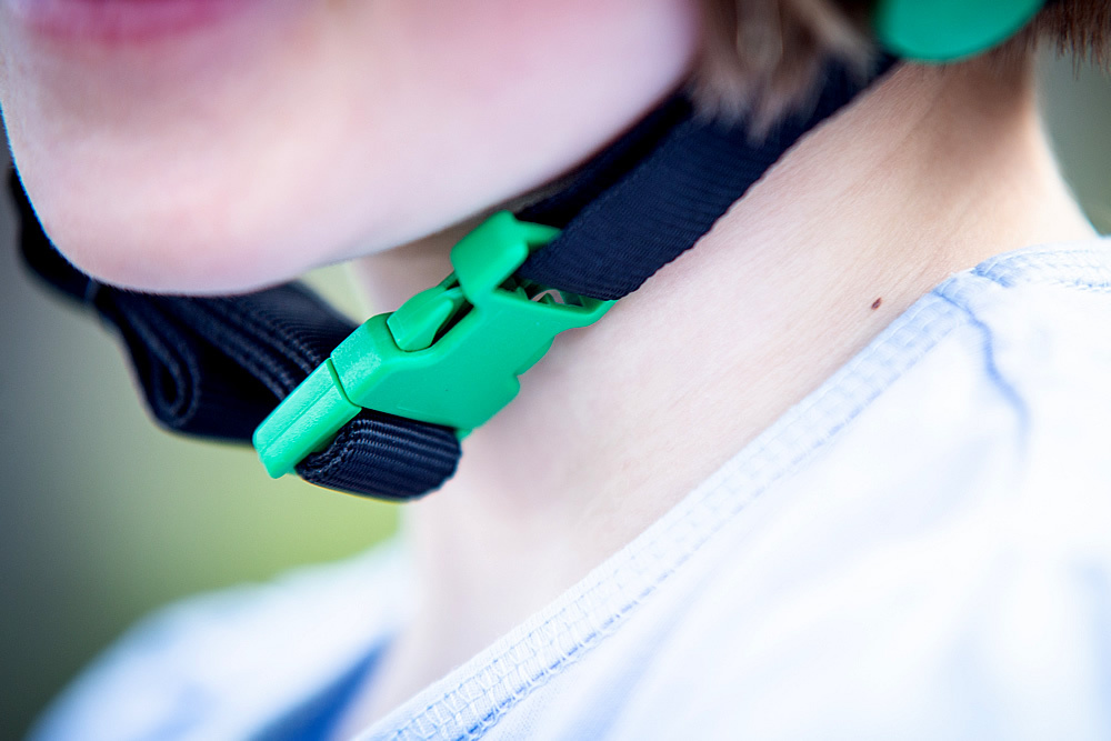 helma má unikátní bezpečnostní přezku "Green buckle" splňující normu EN1080. Přezka se sama rozepne při síle vyšší než 160 N. Tím je zaručeno bezpečí dětí v případě kolize, která by mohla způsobit uškrcení.