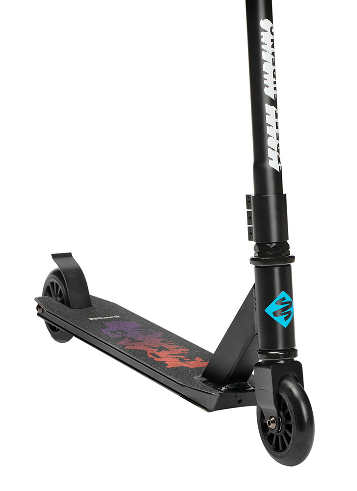 Na této atraktivní a cenově dostupné koloběžce si mohou začátečníci vyzkoušet své první skoky a triky. Konstrukce vyniká svařovanými T řídítky, ocelovou vidlicí, vyztuženou svařovanou hliníkovou deskou a tříbodovou objímkou.