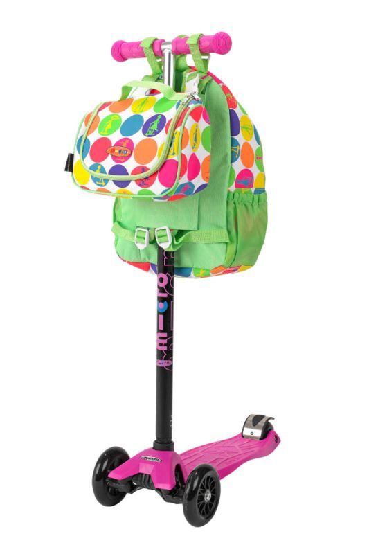 Maxi batoh se svačinovou taškou ve stejném designu. Obě tašky můžete používat odděleně nebo je lze snadno spojit a lehce zavěsit na koloběžku.