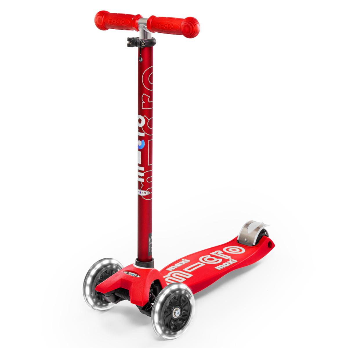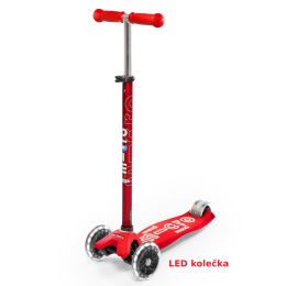 Červená svítící dětská koloběžka Micro Maxi DeLuxe je navržena ve Švýcarsku a je zárukou kvality a dlouhé životnosti.
