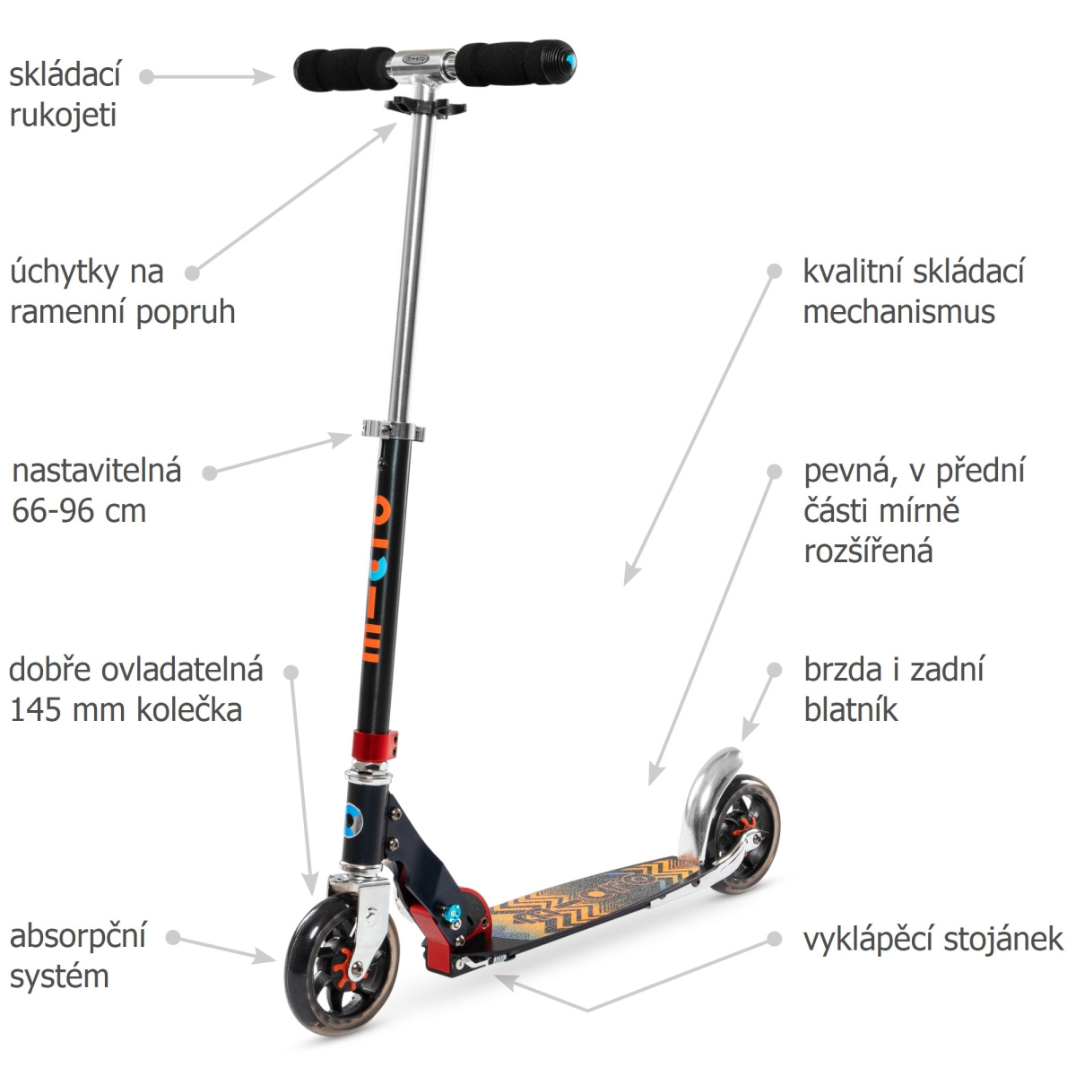 Skládací koloběžka Micro Speed+ je univerzální skládací koloběžka vhodná pro děti, mládež i dospělé. Hlavními přednostmi této koloběžky jsou kolečka o velikosti 145 mm se zabudovaným speciálním absorpčním systémem pro pohlcování nerovností, pevná nášlapná deska, mále rozměry při složení a nízká váha.