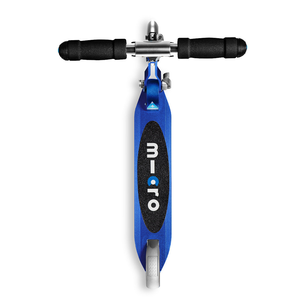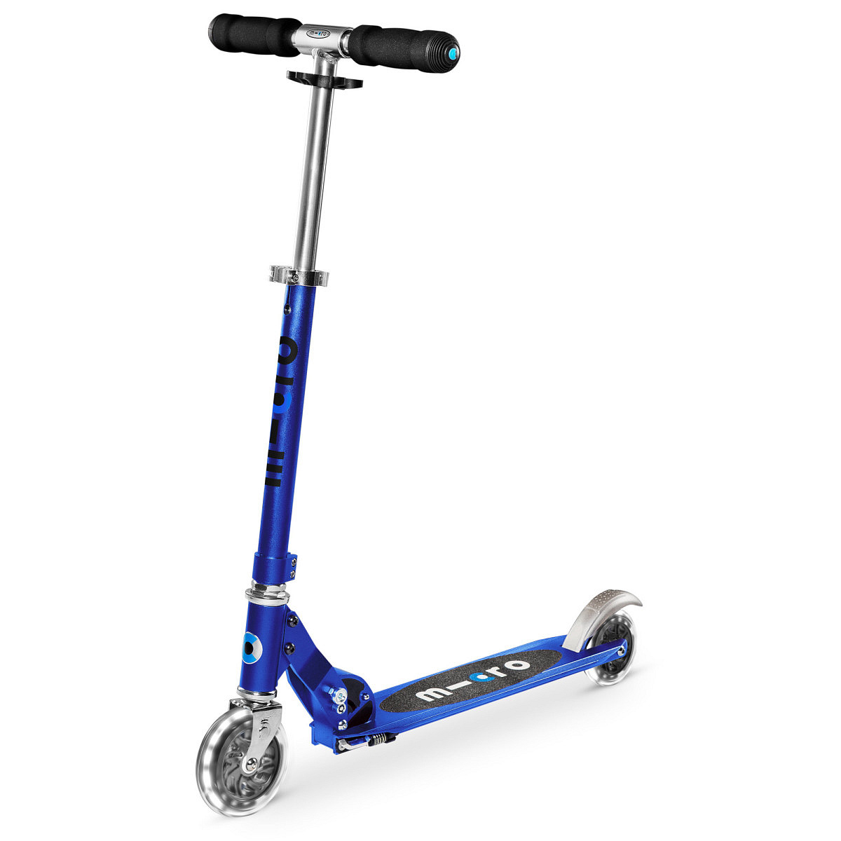 Dětská skládací koloběžka Sprite Saphire Blue s LED kolečky. Je modrou variantou naší dobře ovladatelné, lehké a bezpečné koloběžky s nízko posazenou deskou pro snadný odraz.