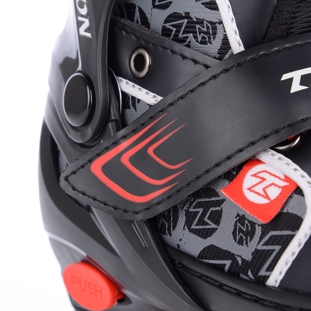 Cuff dětských ledních bruslí je vyroben z PE, který si zachovává houževnatost i při teplotách okolo -25°C. brusle mají jednoduchý a pohodlný systém zvětšení velikosti tlačítkem na boční straně skeletu. Brusli lze nastavit na 4 velikosti.
